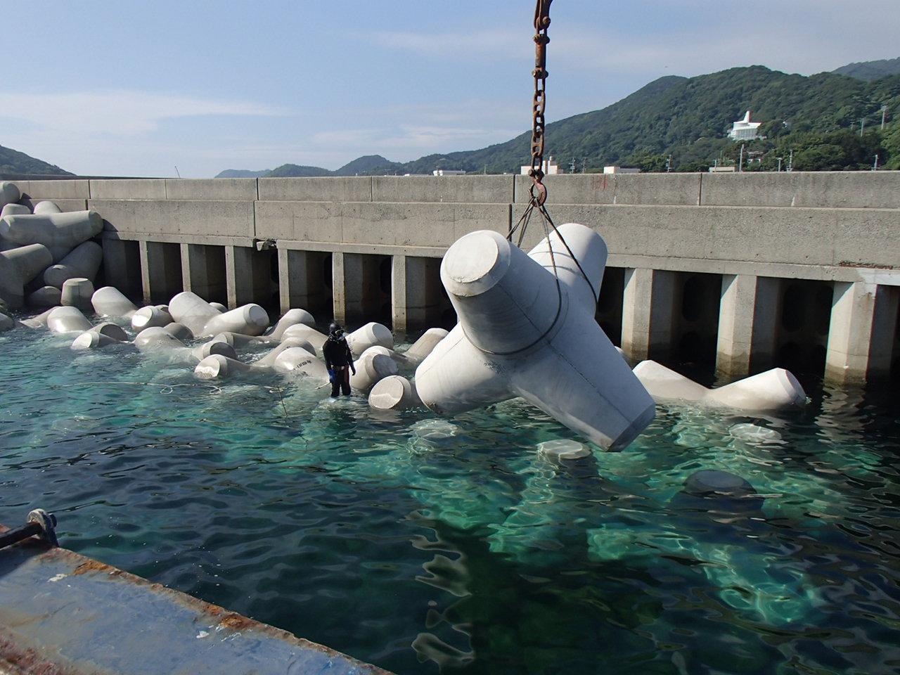 消波工とは、波のうちあげ高、越波、しぶき、波力などを減少させる目的で、堤防又は護岸などの前面に設置される構造物です。波打ち際付近にブロックを設置し、波のエネルギーを弱め、砂浜の後退を防ぐための構造物を設置していきます。